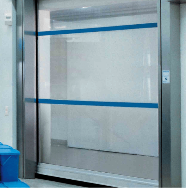 Air purification in clean rooms can lead to a pressure difference of up to 50 Pa. The fully transparent curtain of this clean room door is tightly integrated into the special side guides, minimizing air loss (leakage). This allows for an optimal design of ventilation systems. Additionally, features such as a stainless steel cover on the shaft and operator, along with welded-on spring steel stabilization, further characterize this door.