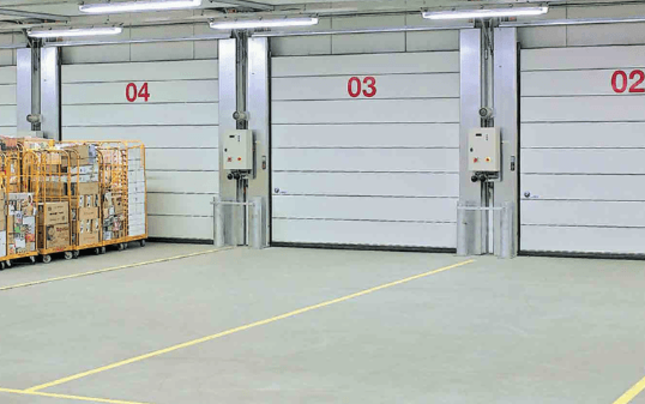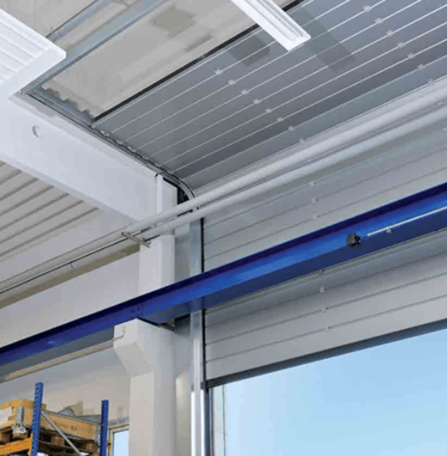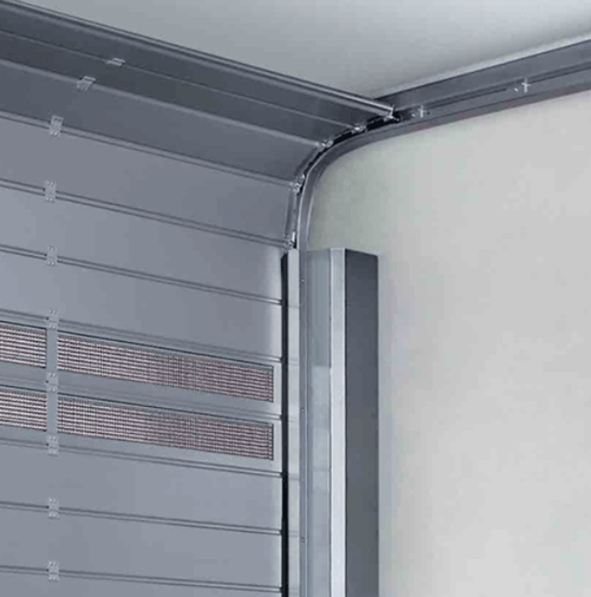 The sections run vertically on the wall of the hall, ensuring that the door cycles are relatively quiet and wear-free. The belt mechanism with counterweights guarantees a long service life with constant use.